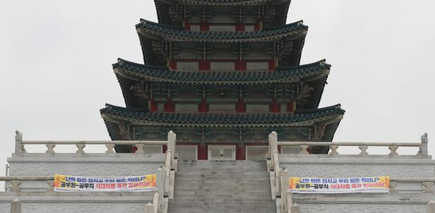 ºÒ±¹»ç û¿î±³¡¤¹é¿î±³¸¦ Çü»óÈÇÑ ¼¿ï Á¾·Î±¸ ±¹¸³¹Î¼Ó¹Ú¹°°ü µ¹°è´Ü °÷°÷¿¡ 18ÀÏ ÀÌ·± ±ÛÀÌ ÀûÈù ¹Î³ëÃÑ Çö¼ö¸·ÀÌ °É·Á ÀÖ¾ú´Ù. ÀÌ °è´ÜÀº °ü¶÷°´µéÀÇ »çÁø ÃÔ¿µ ¸í¼Ò´Ù. ÇÏÁö¸¸ À̳¯ ¿©¼¸ »ì ¾Æµé°ú À̰÷À» ãÀº °ü¶÷°´ À±¸ð(37)¾¾´Â µ¹°è´Ü ¾Õ¿¡¼ À̸®Àú¸® Çö¼ö¸·À» ÇÇÇØ »çÁøÀ» Âï¾î º¸·Á´Ù°¡ ¡°¾È µÇ°Ú³×¡±¶ó¸ç µ¹¾Æ¼¹´Ù. ÀÌ·± Çö¼ö¸·Àº ÀÛ³â 8¿ù¿¡µµ 1°³¿ù°£ °É·È´Ù. ÀνºÅ¸±×·¥À» °Ë»öÇϸé, ´ç½Ã ¹æÇÑ ¿Ü±¹ÀεéÀÌ ÀÌ µ¹°è´ÜÀ» ¹è°æÀ¸·Î ÂïÀº »çÁø¿¡ Çö¼ö¸·±îÁö ±×´ë·Î ´ã°Ü ÀÖ´Ù. ±× »çÁø¿¡ ¡®(µå¶ó¸¶) ´ëÀå±ÝÀÌ ±â¾ï³´Ù¡¯ µî Çѱ¹ ¿©Çà ¼Ò°¨À» Àû¾î³ù´Ù. ¹Ú¹°°ü ÃøÀº ¡°°ü¶÷°´ ÀÔÀå¿¡¼ ºÒÆíÇØµµ ¿ì¸®·Î¼´Â ¾îÂîÇÒ ¹æ¹ýÀÌ ¾ø´Ù¡±¸ç ¡°³ëÁ¶°¡ Àڱ⠻ç¾÷Àå ³»¿¡ Çö¼ö¸·À» °Å´Â °ÍÀº ¡®ÇÕ¹ýÀû ³ëÁ¶ È«º¸ Ȱµ¿¡¯ÀÌ¾î¼ °Á¦ ö°Å´Â °ï¶õÇÏ´Ù¡±°í Çß´Ù.